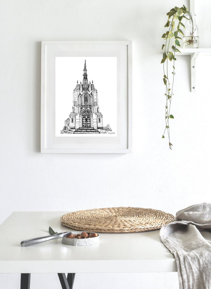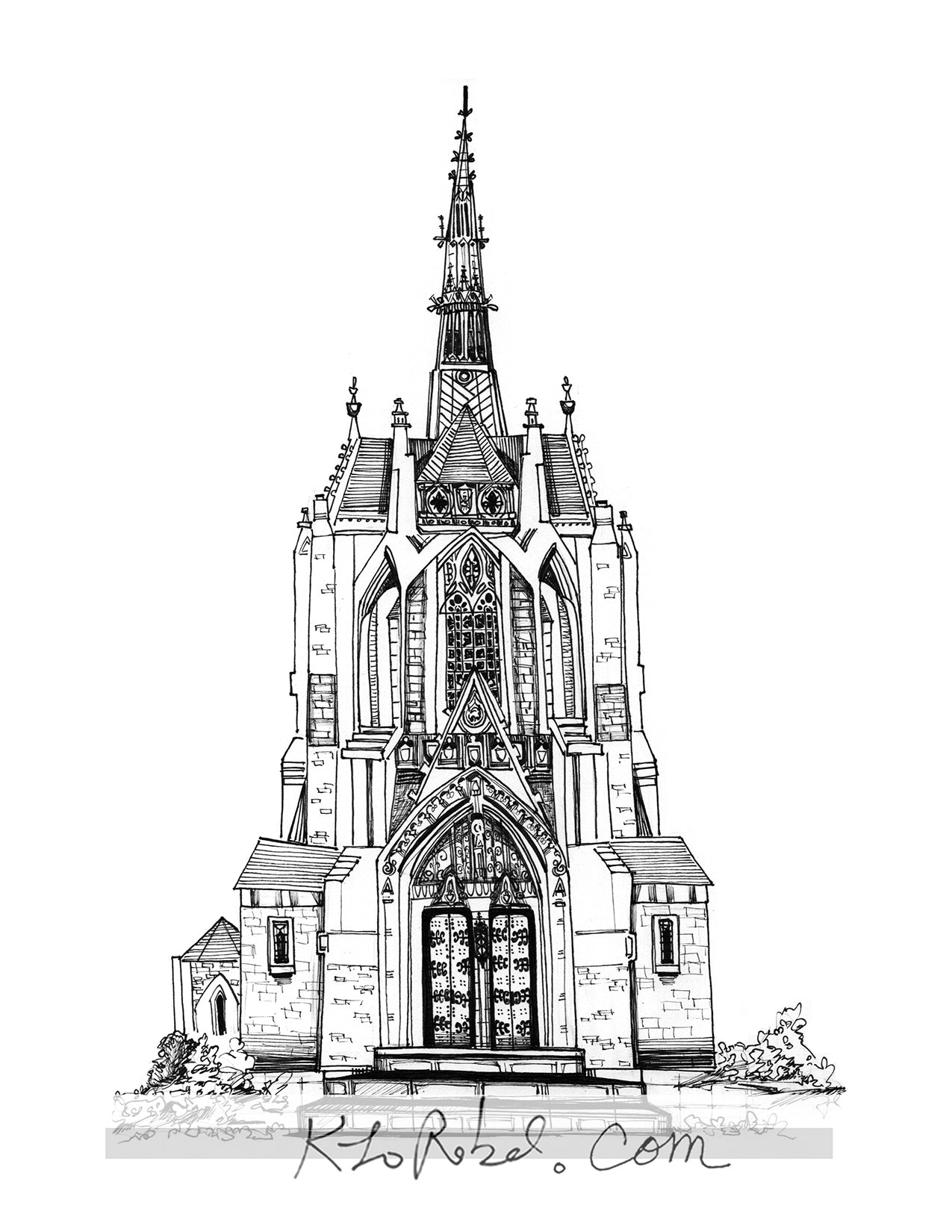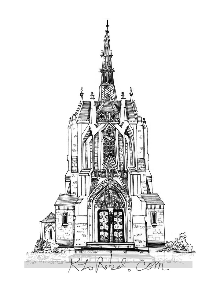 A hand drawn design of Heinz Chapel in the Oakland area of Pittsburgh, PA — created by Kirsten Lowe-Rebel.