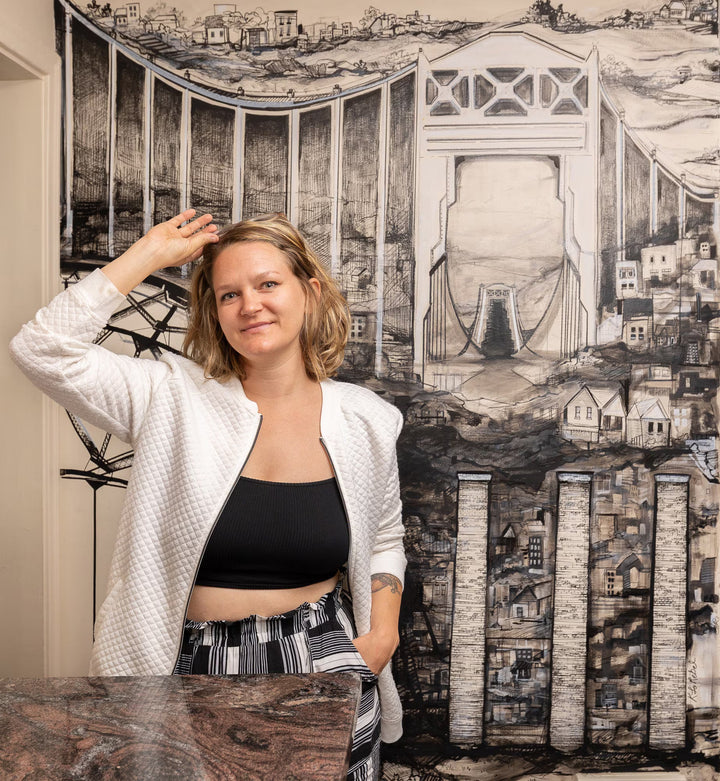 A pen and ink drawing of the legendary "Dodger Stadium" in Los Angeles — created by Kirsten Lowe-Rebel.