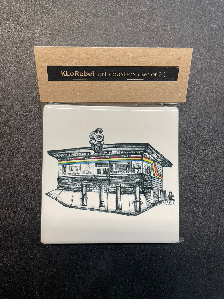 Two sandstone coasters drawn and designed by Pittsburgh artist Kirsten Lowe-Rebel of KLoRebel Art. These coasters are sold in a set of two, this set featuring Pittsburgh's beloved Page's Dairy Mart