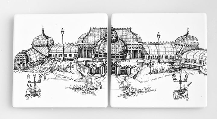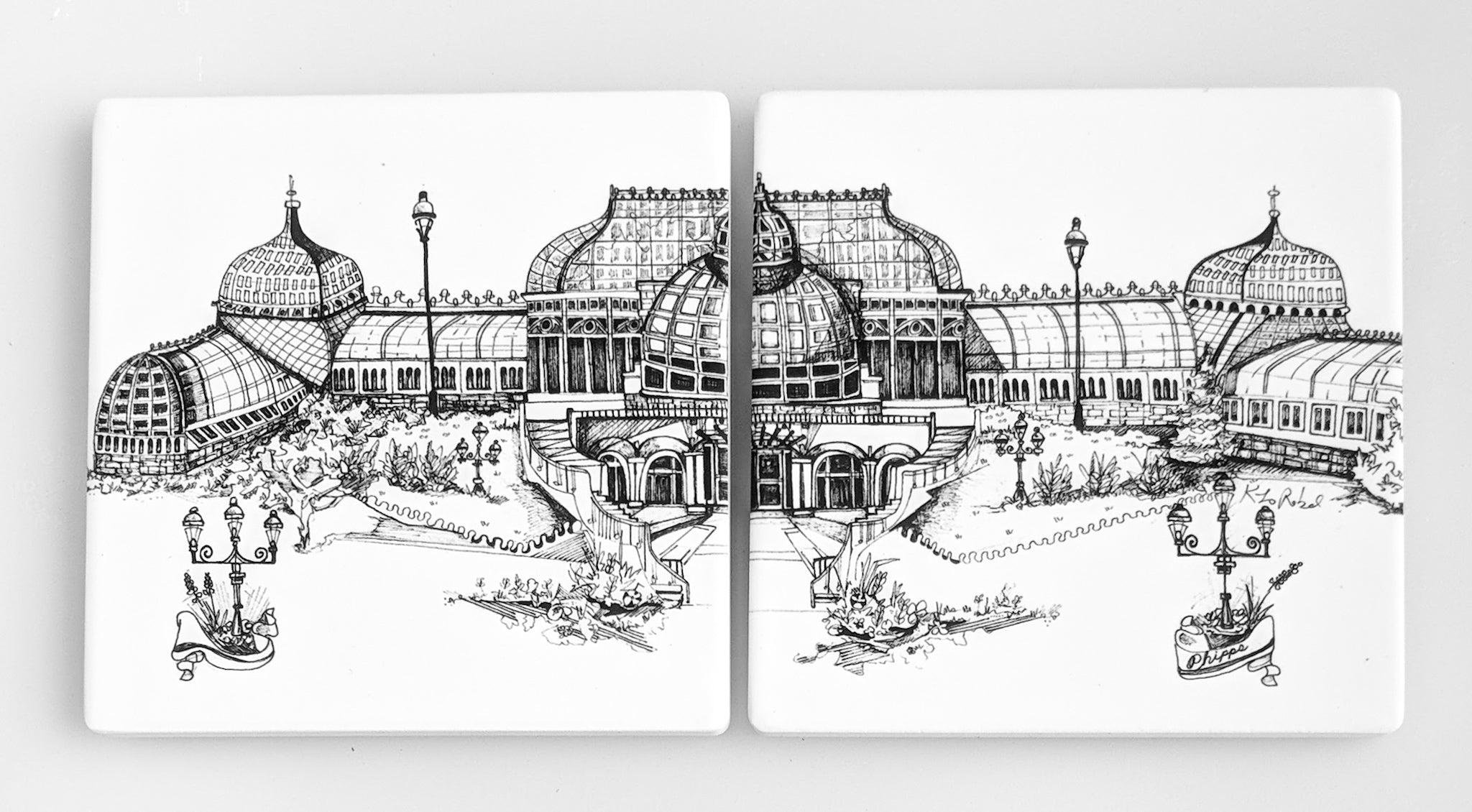 Two sandstone coasters drawn and designed by Pittsburgh artist Kirsten Lowe-Rebel of KLoRebel Art. These coasters are sold in a set of two, this set featuring our beloved "Phipps Conservatory"