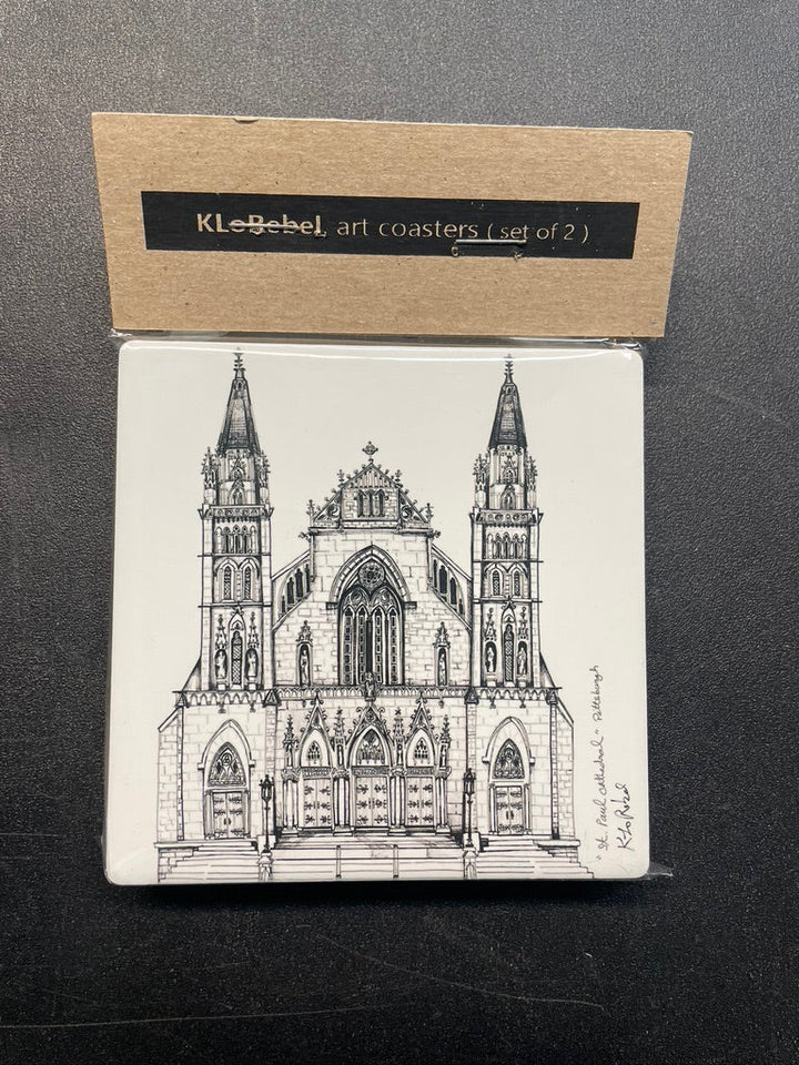 Two sandstone coasters drawn and designed by Pittsburgh artist Kirsten Lowe-Rebel of KLoRebel Art. These coasters are sold in a set of two, this set featuring Pittsburgh's "St. Paul's Cathedral"